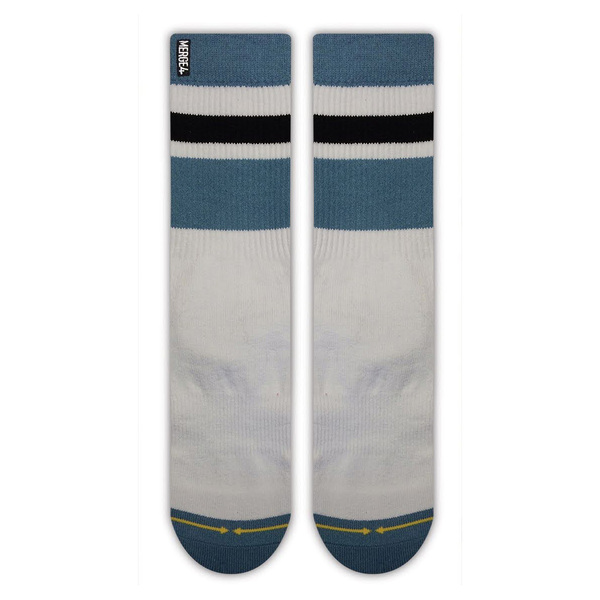 Klasické bílé ponožky s černými a modrými pruhy a navíc se žlutou podpisovou šipkou MERGE4. Ponožky jsou součástí kolece MERGE4 Essentials - ne úplně obyčejné ponožky pro každodenní život. A nezapomeň omrknout citát pro štěstí na vnitřní straně ponožek!