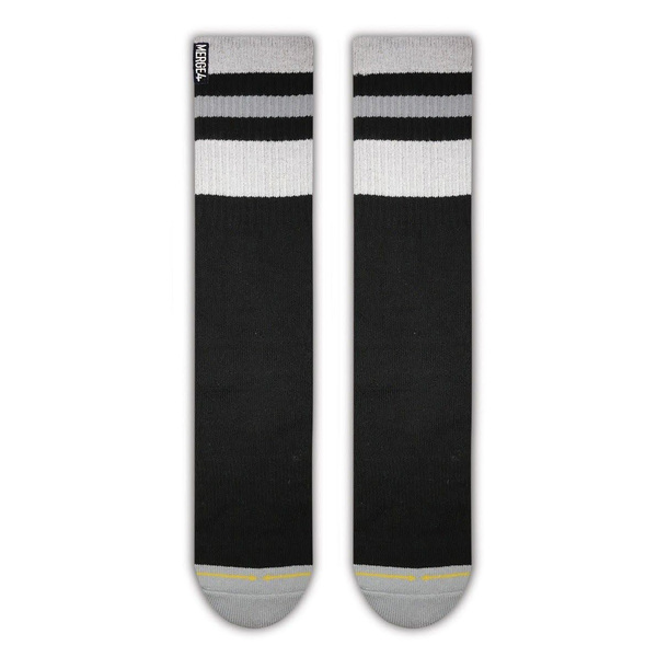 Vysoké černé ponožky se světle šedými a modrými pruhy a navíc se žlutou podpisovou šipkou MERGE4. Ponožky jsou součástí kolece MERGE4 Essentials - ne úplně obyčejné ponožky pro každodenní život. A nezapomeň omrknout citát pro štěstí na vnitřní straně ponožek!