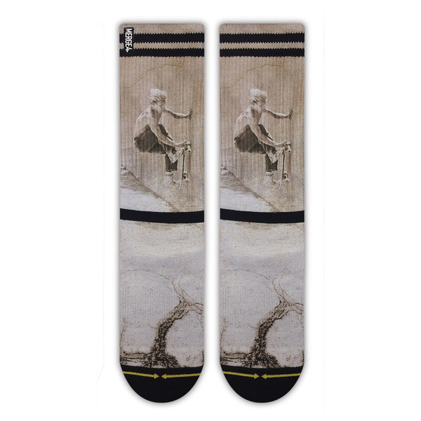 "PŘEKÁŽKY JSOU CESTA" Byla to doba, kdy paradigmata byla bořená a změny byly nežádoucí. A Mofo - nedávno uveden do síně slávy skateboardingu - zachycuje Natase Kaupase na těchto ikonických skejtových ponožkách.