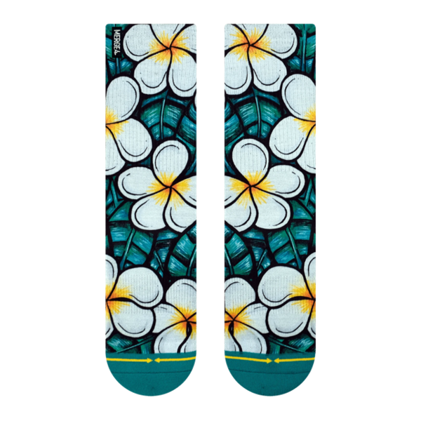 Tyto unisex ponožky s havajským potiskem obsahují umělecká díla naší místní mladé umělkyně Kaia Myall. Ať už jim říkáte 'plumeria' nebo 'frangipani', s těmito krásnými květinovými ponožkami se budete usmívat od ucha k uchu. Udržujte své nohy spokojené s elastickou podporou klenby, bezešvou špičkou a patou a zesíleným chodidlem, které tlumí nárazy a odvádí vlhkost.